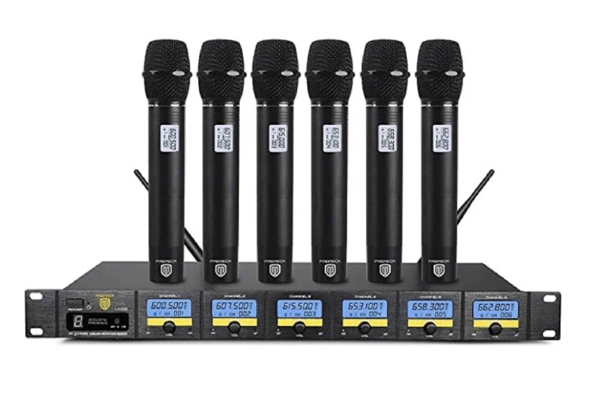 - Six undirectional cardioid microphones deliver clear and loud sound; Made of metal and energy-saving; Each microphone needs 2xAA batteries(not included); Fixed frequency: 600.5-607.5-615.5-653.1-658.3-662.8MHz; Note: 2 sets can not be used together. Suitable for 110V/23 Comes with 1 x Receiver, 6 x microphones, 1 x 6.35mm TS cable, 1 x power charger, 1 x user manual; Receiver size: 21x 13.5x 3.2inch; Microphone size 9.3*1.8inch; Guaranteed high quality and reliability.